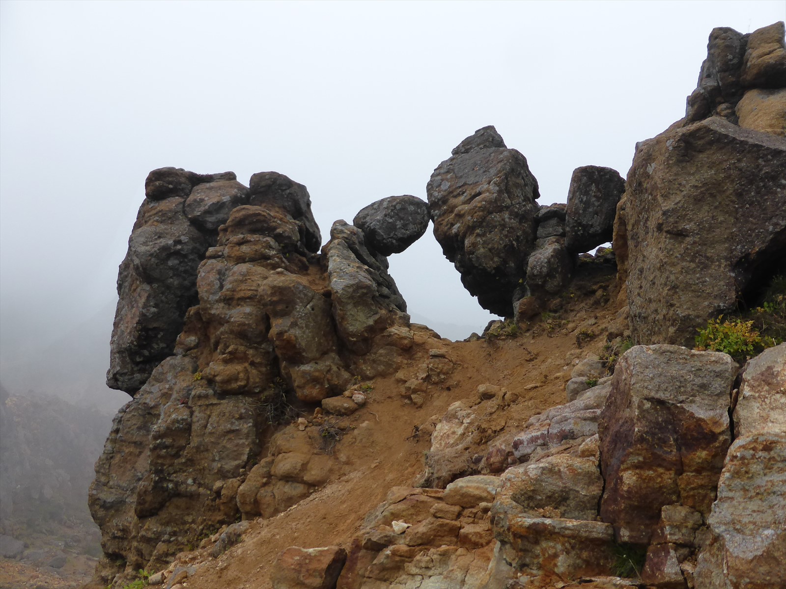 ガスの中、岩場を進みます